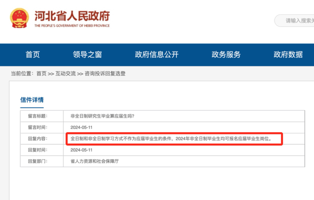 河北省人力资源和社会保障厅回应:“全日制和非全日制学习方式不作为应届毕业生的条件,2024年非全日制毕业生均可报名应届毕业生岗位”
