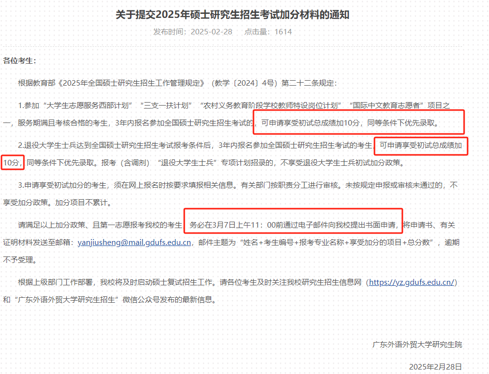 请满足加分政策、且第一志愿报考我校的考生务必在3月7日上午11:00前通过电子邮件向我校提出书面申请多申请书、有关证明材料发送至邮箱:yanjiusheng@mail.gdufs.edu.cn,邮件主题为"姓名+考生编号+报考专业名称+享受加分的项目+总分数”,逾期不予受理。
