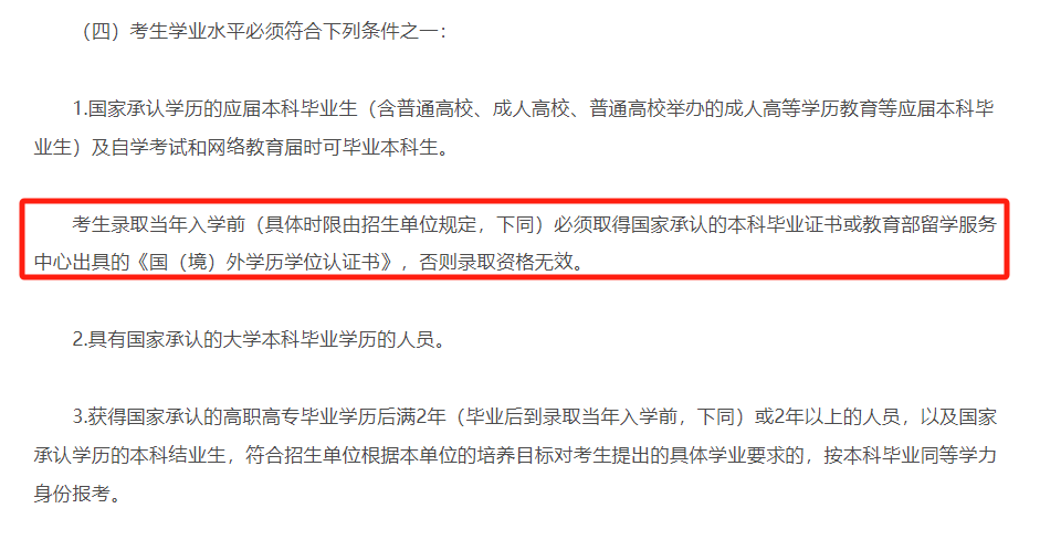 教育部《2024年全国硕士研究生招生工作管理规定》中明确:在研究生录取入学前,必须拿到毕业证,否则录取资格无效。