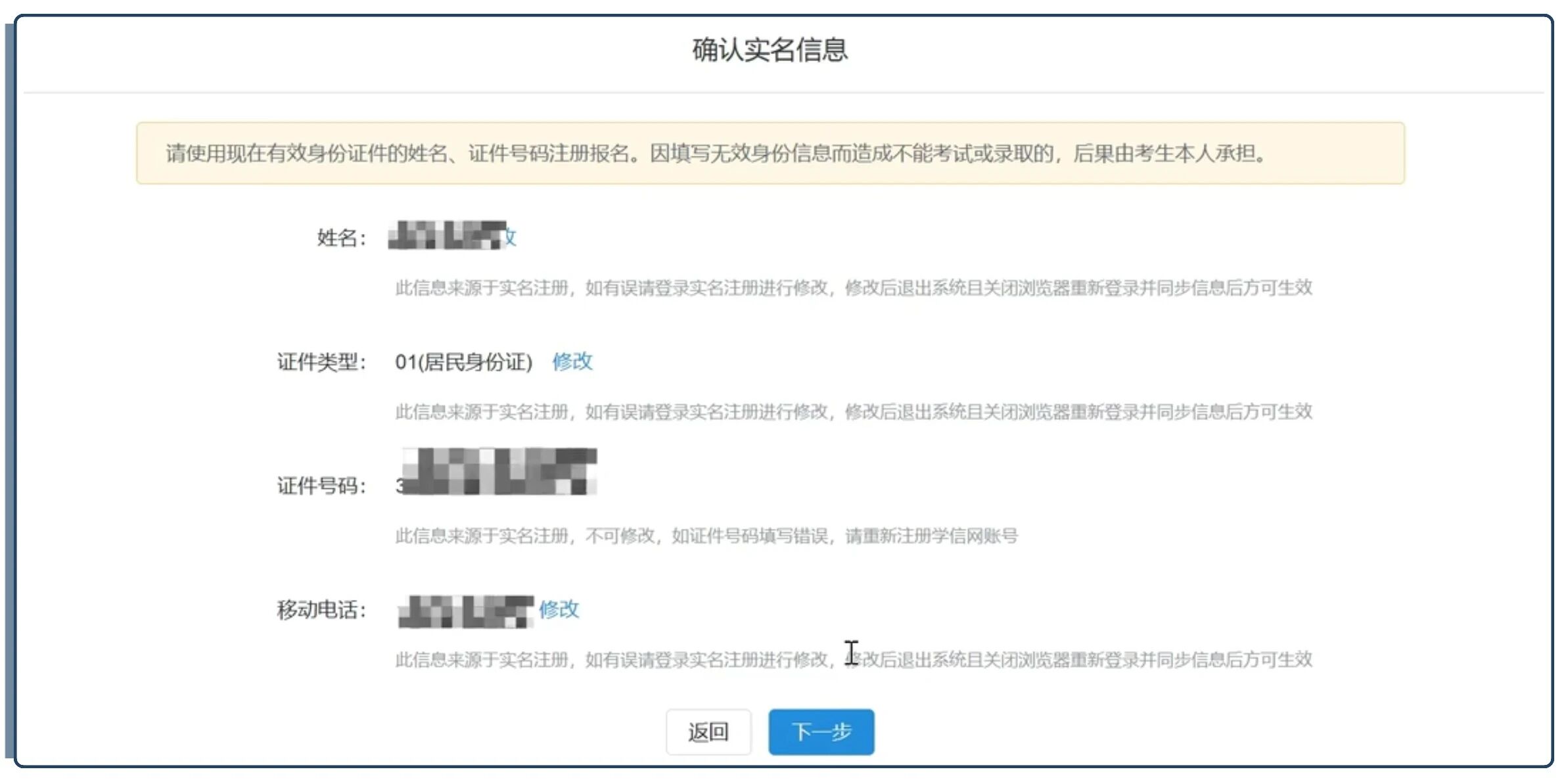 确认考生信息:确定无误后点击确认,然后返回主页,填写考生报考信息