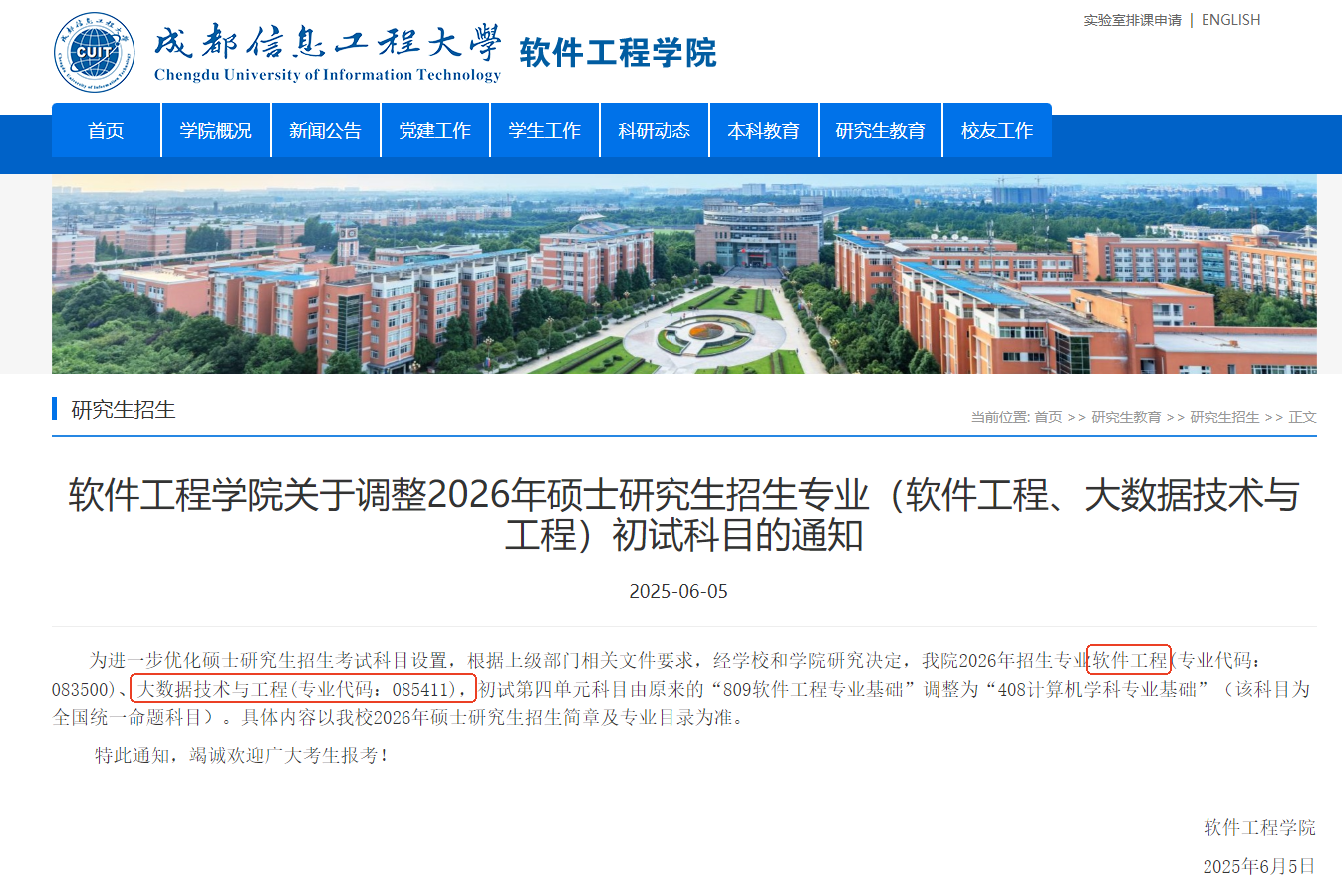 经学校和学院研究决定,我院2026年招生专业软件工程(专业代码:083500)、大数据技术与工程(专业代码:085411),初试第四单元科目由原来的“809软件工程专业基础”调整为“408计算机学科专业基础”(该科目为全国统一命题科目)。