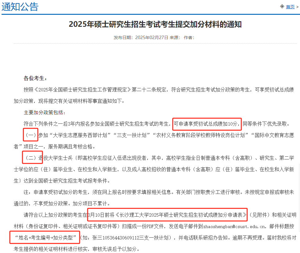 请符合加分政策的考生在3月10日前将《长沙理工大学2025年硕士研究生招生初试成绩加分申请表》和相关证明材料(身份证复印件、相关证明或证书复印件等)扫描成一份PDF文件,发送电子邮件到zhaoshengban@csust.edu.cn,邮件标题按“姓名+考生编号+加分类型”,并电话联系研招办告知。逾期不再受理。
