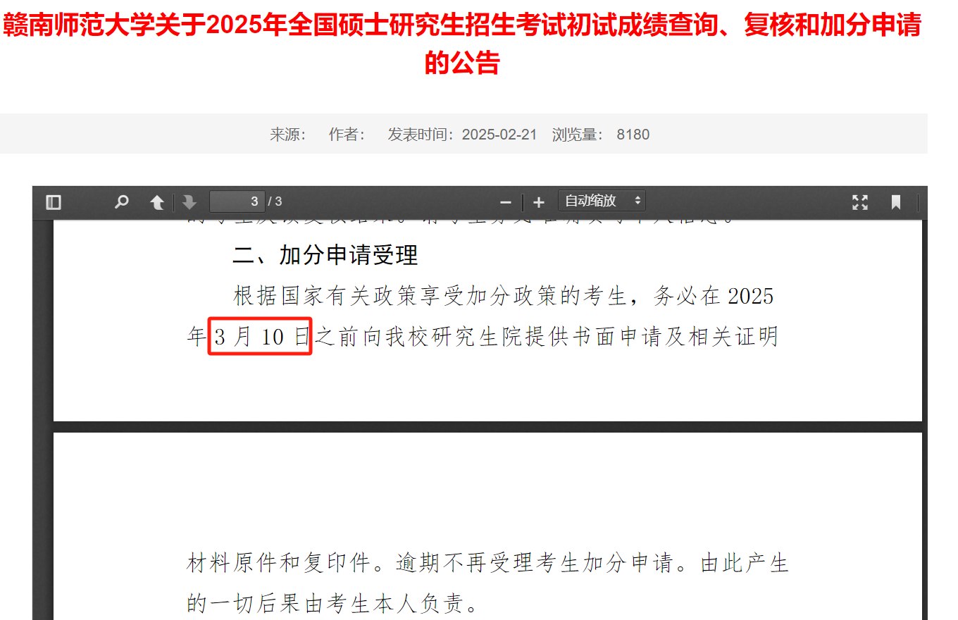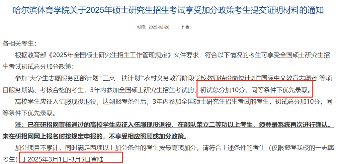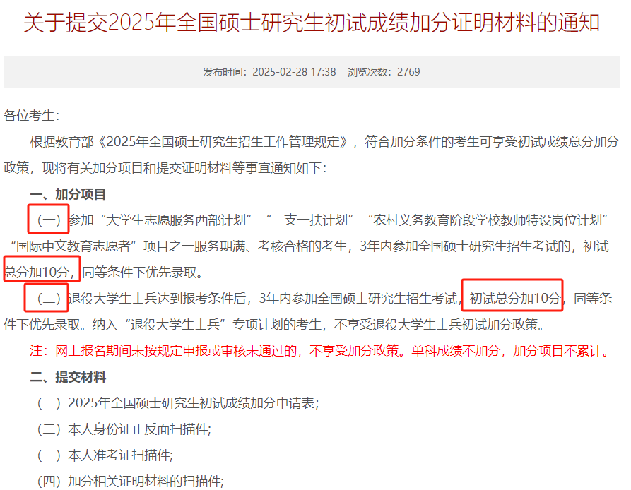 根据国家有关政策享受加分政策的考生,务必在2025年3月10日之前向我校研究生院提供书面申请及相关证明材料原件和复印件。逾期不再受理考生加分申请。