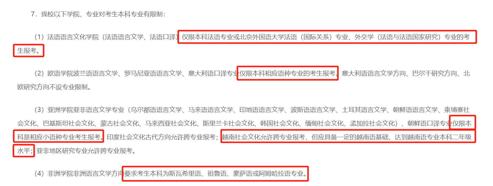 北京外国语大学的法语语言文化学院、亚洲学院等都对部分专业做了报考限制。