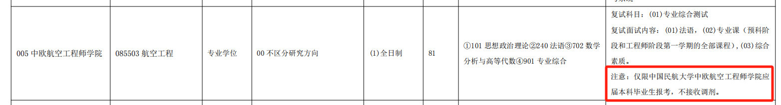 中国民航大学中欧航空工程师学院的航空工程专业也表明:仅限本学院应届毕业生报考,且不接受调剂。