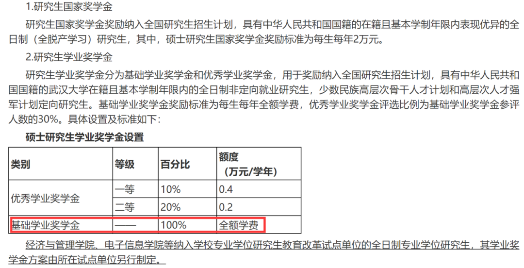 根据官网上的2024年研究生奖助学金政策说明,武大设置有研究生国家奖学金、研究生学业奖学金、实施研究生国家助学金,并与现有研究生学术创新奖励政策、专项奖学金政策相结合,进一步改善研究生学习、科研和生活条件,提高研究生待遇。其中,基础学业奖学金是100%全覆盖的,可以完全抵消学费。除此之外,还有1.5-8万元/学年的学术创新奖学金 。