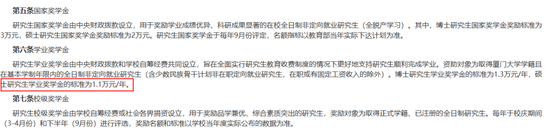 厦门大学的学业奖学金:第一年全覆盖,每生1.1w,第二年和第三年不挂科可领,一次性发放。除在职学生外,要是上岸厦大,学业奖学金相当于间接免学费了,所以第二年第三年努力不挂科噢!