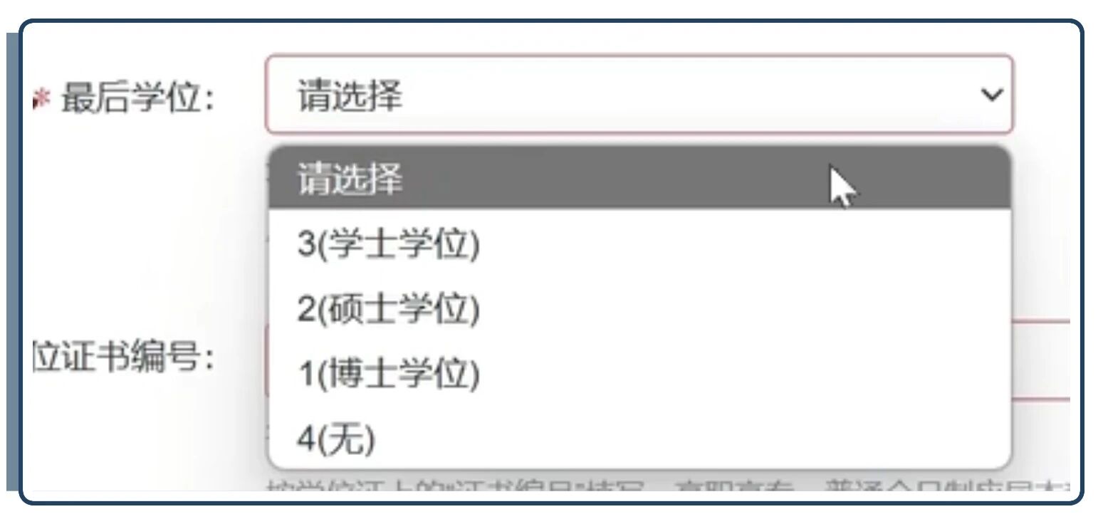 最后学位:本科有学位选学士学位,没有学位证或者专科考研选无
