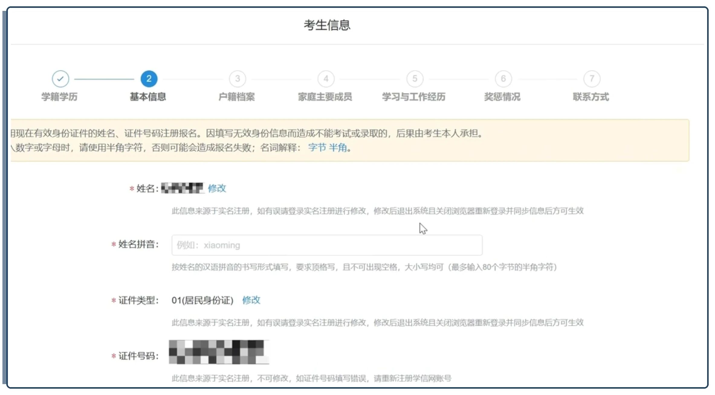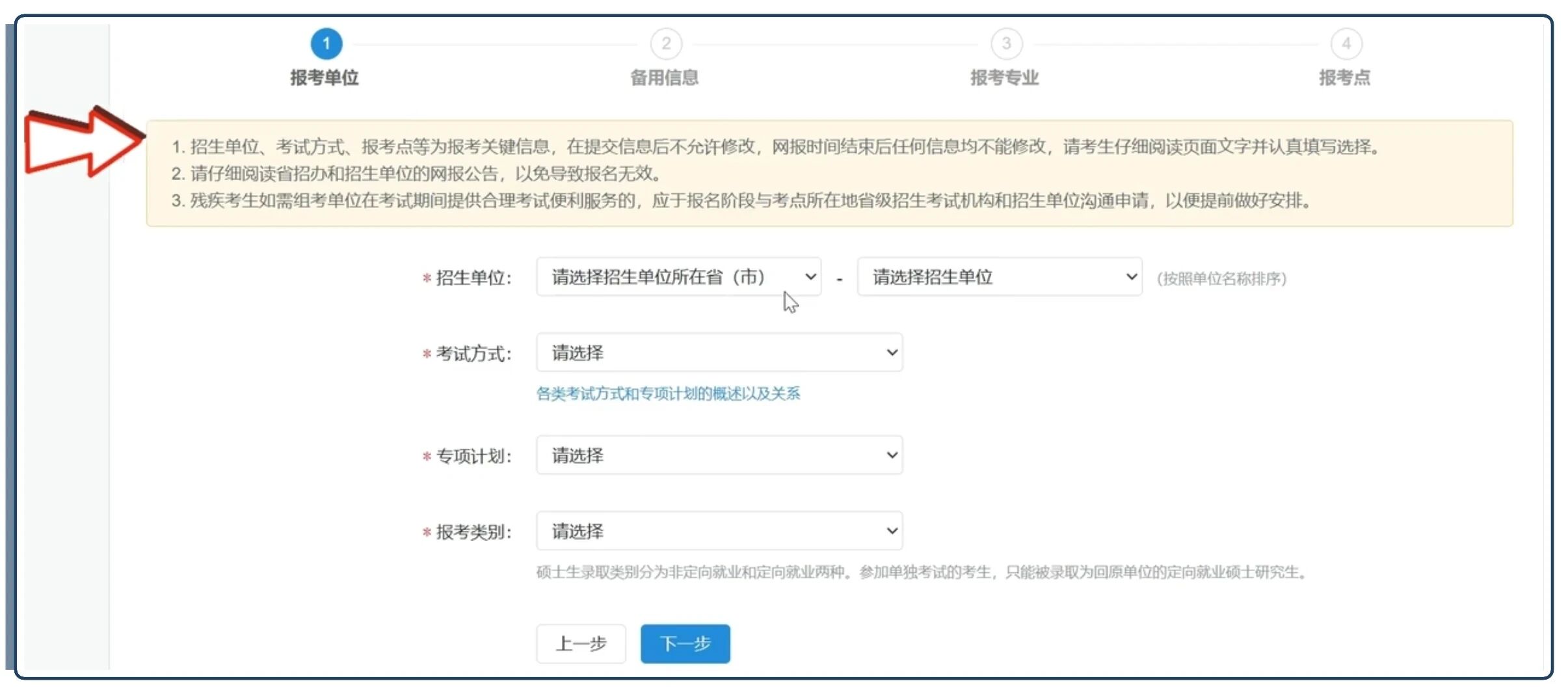 注意:招生单位、考试方式、报考点都属于关键信息,填写完不允许修改,如果要修改,之前的报名信息就要取消掉重新报