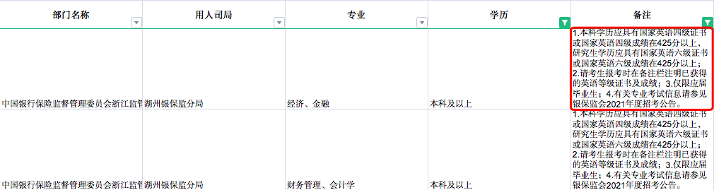 在<国考和省市级公务员招考职位表>中,许多职位在备注栏里明确规定——大学英语水平需达到四级或六级,没有达到要求报考的话,审核是不会通过的。