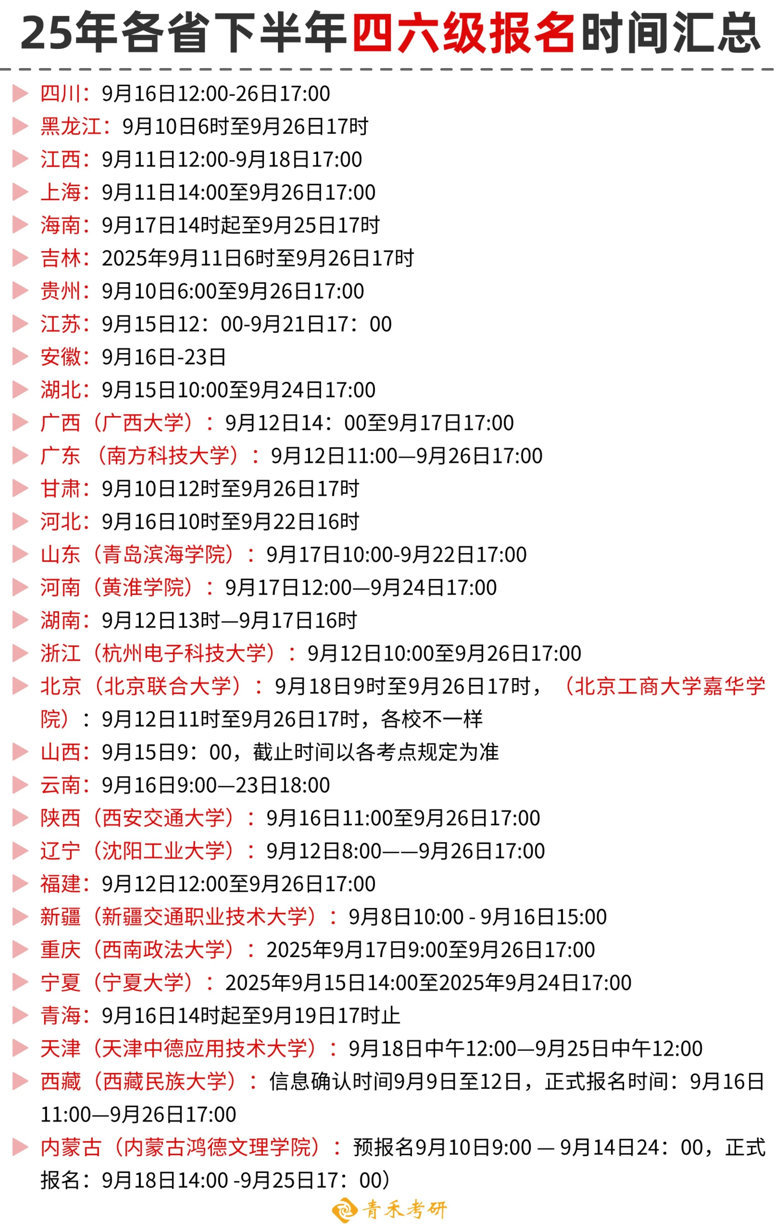 四六级报名还没结束,给大家附上全国各省报名时间: