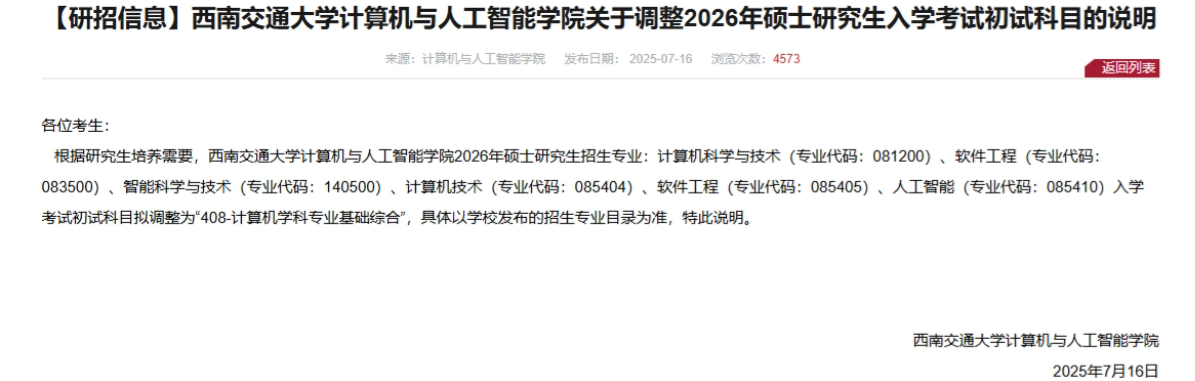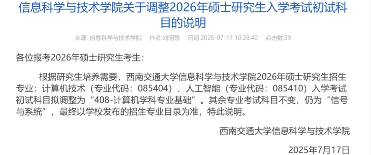 西南交大三个学院均调整为408