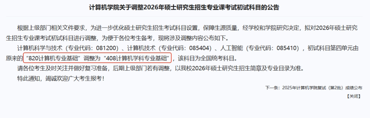25考研专业课第四门为:820计算机专业基础&860软件工程学科基础综合的,调整为408计算机学科专业基础