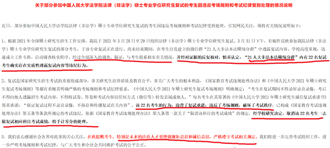 2021年硕士研究生招生,法律(非法学)专硕,22名考生取消复试成绩。该专业复试正在进行、尚未结束期间,在考生自发建立的微信群“21人大非法本法硕统分群”中透露复试内容。经过全面深入的调查、取证,与考生联系核实有关情况,并经对证据的反复核对,慎重认定,“21人大非法本法硕统分群”内有22名复试考生确实存在实质性透露复试内容等违纪行为。