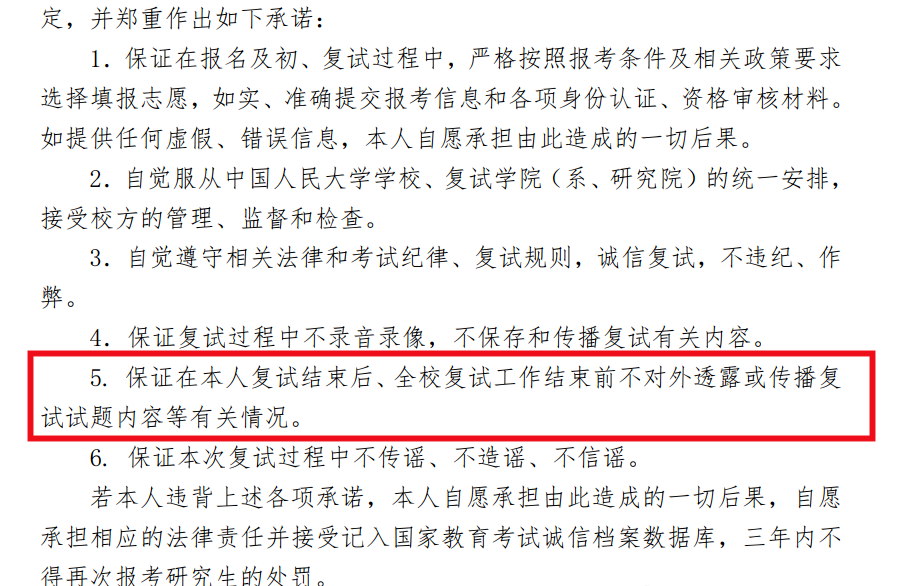 复试内容(尤其是专业课和面试题)属于国家机密级材料,考生在复试前签署的承诺书中已明确要求保密,违规即构成“失信”。